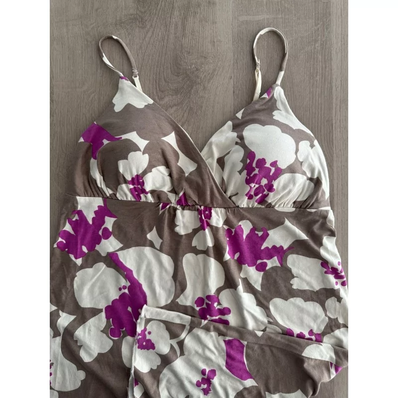 Bretelles fines réglables, coupe féminine avec décolleté croisé. Tissu stretch près du corps, léger et agreable à porter en été. Motif floral brun et fuchsia. Parfaite pour l'été, les vacances.