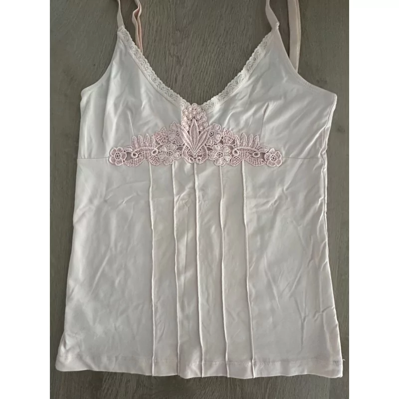 Joli top rose pâle avec fines bretelles et détail de dentelle florale sur le devant.